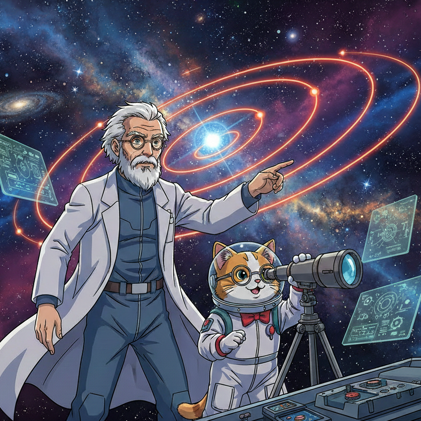 猫のチャーは坊さんの座布団に鎮座する ■近藤博士の生涯の創作物語 エンディの理論によるシミュレーター うなり軌道シミュレーション 質量変動による近点移動 振幅による軌道形状 双曲線軌道シミュレーター 天体軌道のシミュレーション